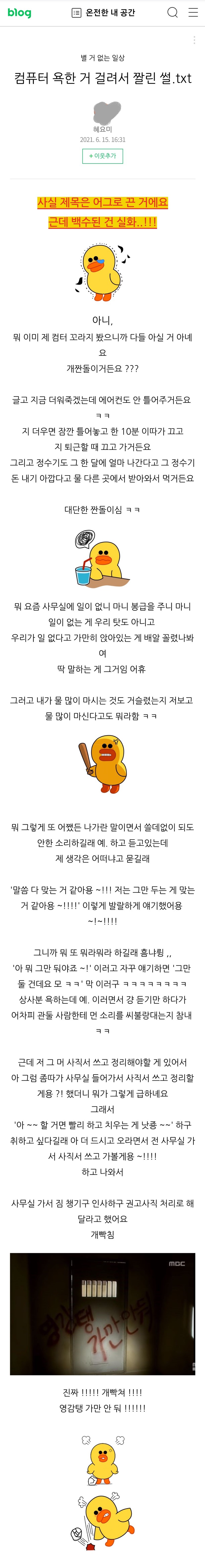 저 병아리 임티 넘 잘 쓰시는거같아요 ㅋㅋㅋ 맛집블로거 급발진 글까진 많이 봤는데 회사 관둔 후기는 첨보네요 본인 맛집블로거 아니고 일상블로거라고 ㅋㅋㅋㅋㅋㅋㅋㅋ 2
