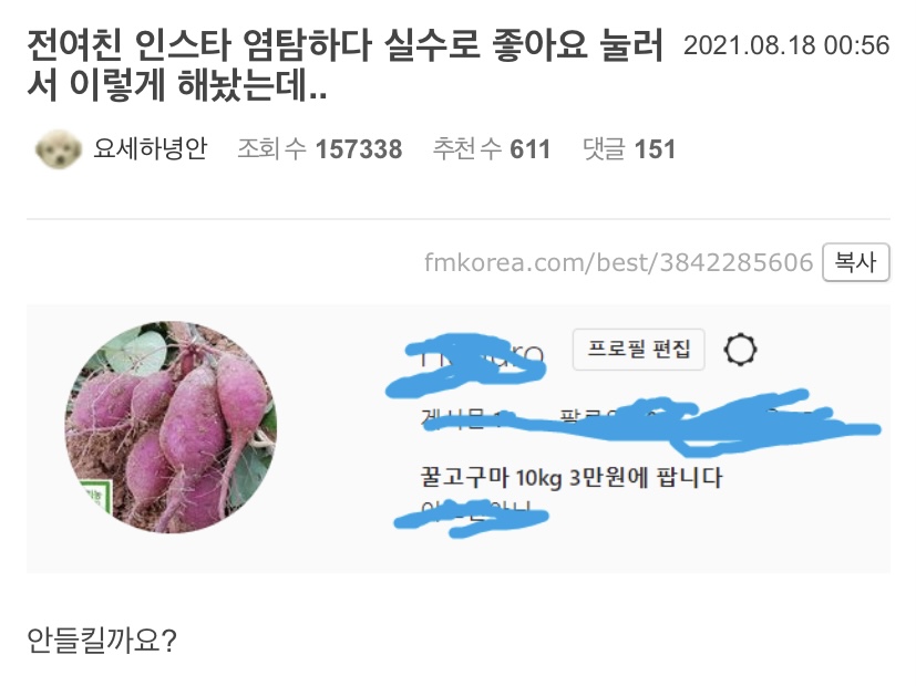 | Subject | 전여친 인스타 염탐하다 실수로 좋아요 눌러서 이렇게 해놨는데.. |