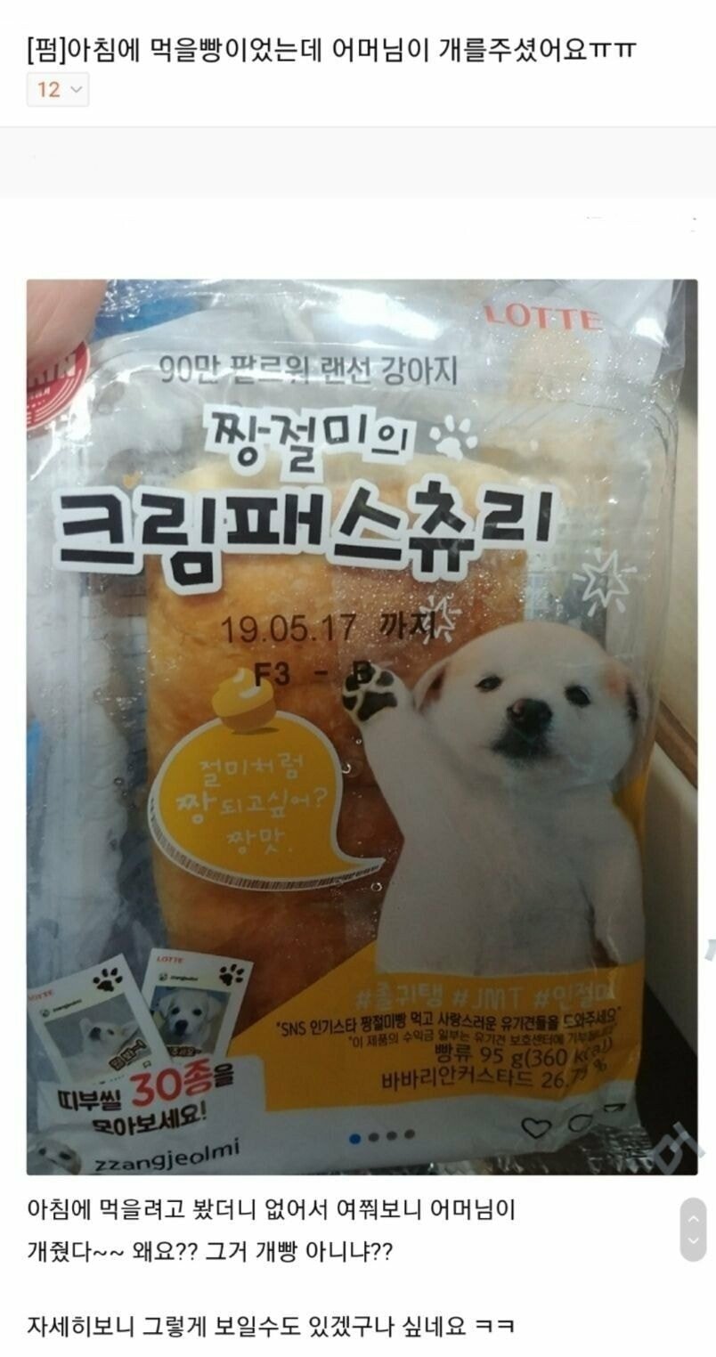 | Subject | 아침에 먹을 빵이었는데 어머님이 개를 주셨어요 |