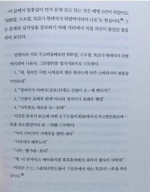 번역문 말 한마디 서로 주고받을 때 보면 한국말, 일본말, 영어가 한데 섞여 뒤범벅이 되어 나온다. 그 심한 예시를 몇 가지 참고하여 인용한다. "얘, 정숙인 이번 일요일 결혼 한다는데 아주 괜찮은 옷감이 많더라" "정숙이가 곰보인데도 신랑이 OK했다지?" "신랑이 반한 게 아니라 정숙이가 반했대" "과연 새로운 뉴스인데" 이것은 어떤 여학생들이 가두에 서서 주고받았던 회화의 한마디를 사생한 것이다. 또 한가지 예시를 인용한다. "어이 너 너 가케우동 한턱 내라" "이 자식아 '해브 노(Have No)'다" "나도, '졘기 녜트(деньги нет)'(돈 없음)다" "얘, 너 콘사이스 영일사전 헌책방에다 팔아서 단팥죽(ぜんざい) 사먹자!" 이것은 17, 8세의 중학생들이 하숙방에서 하는 대화의 한마디를 따온것이다. ----------- 어떤 부분은 2021년 중학생 말투 같네요 ㅎㅎ 3