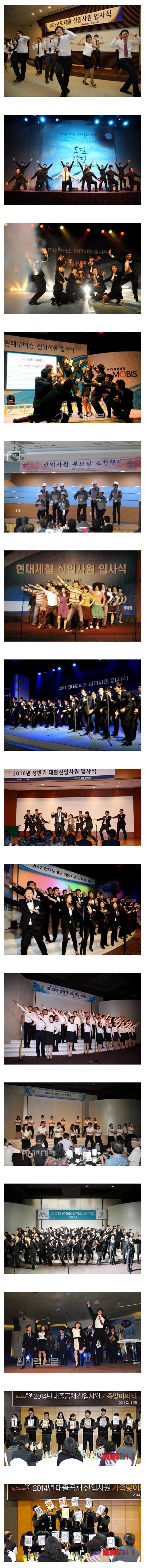 요새는 모르겠고 저 신입연수때 강제로 장기자랑 시키는데 퇴사 마렵더라능. 먼 유치원생들 부모님 모셔놓고 인디언분장 하는것도 아니고요. 진심 다 큰 성인들한테 저런거 왜 시키는거임? 그럴시간에 직무교육이나 더 해주지. 1