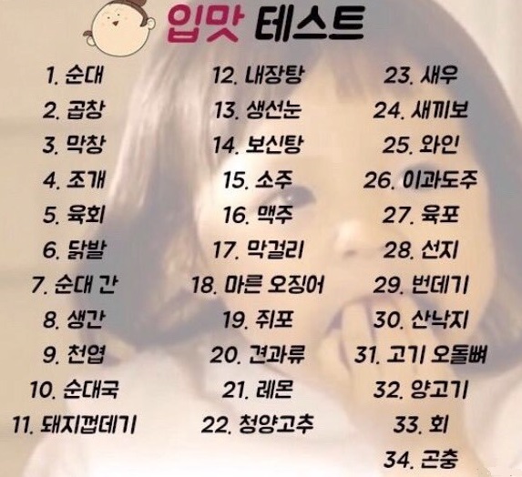 0~5개 : 유치원입맛 6~10개 : 초등학생 11~15개 : 중학생 16~20개 : 보통 21~25개 : 어른 26~29개 : 아줌마 30~33개 : 아저씨 34개 : 베어그릴스 0