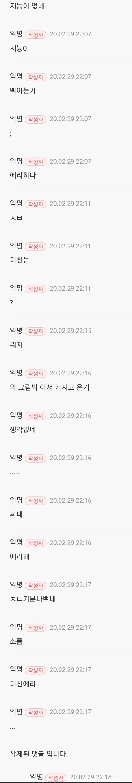 익명게시판에 작성자 표기가 되는걸로 업데이트 되자 지난 몇몇 글들이 글쓴이의 자작극이였던걸로 밝혀짐 0