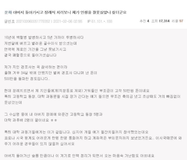 | Subject | 아버지 장례식을 치르고 인생 현타가 온 사람.jpg |