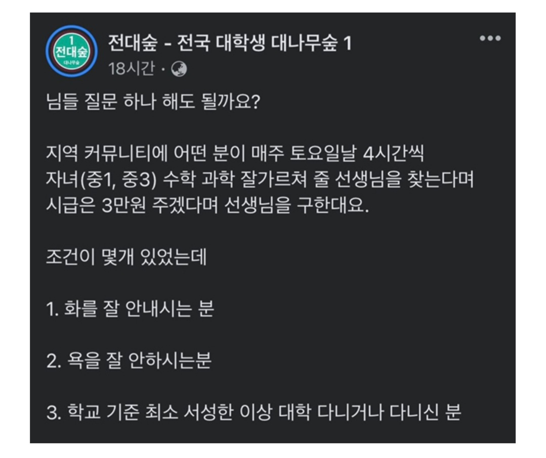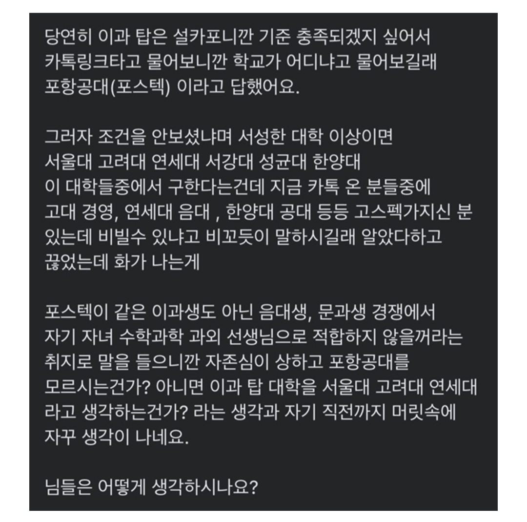 주작 냄새가 나긴 하는데 진짜라면 포스텍이라고 해서 모른건가… 자녀 수학/과학 과외선생을 구한다면서 포공을 모를 수가 있나요.. 0