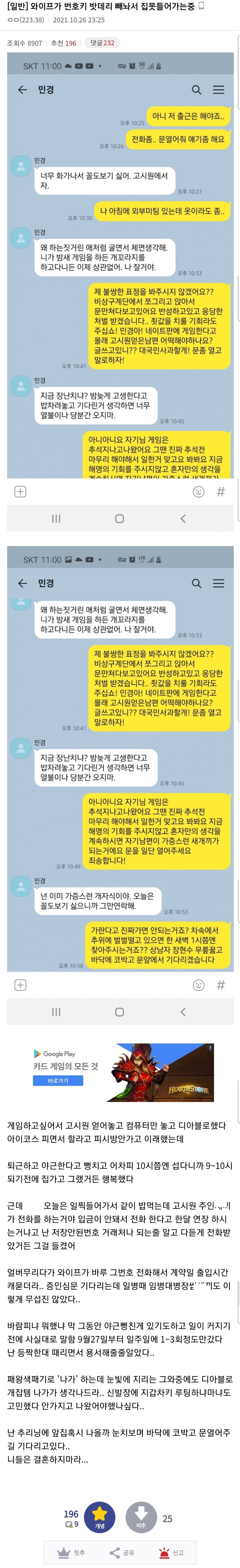 | Subject | 와이프가 번호키 밧데리 빼놔서 집못들어가는중 |