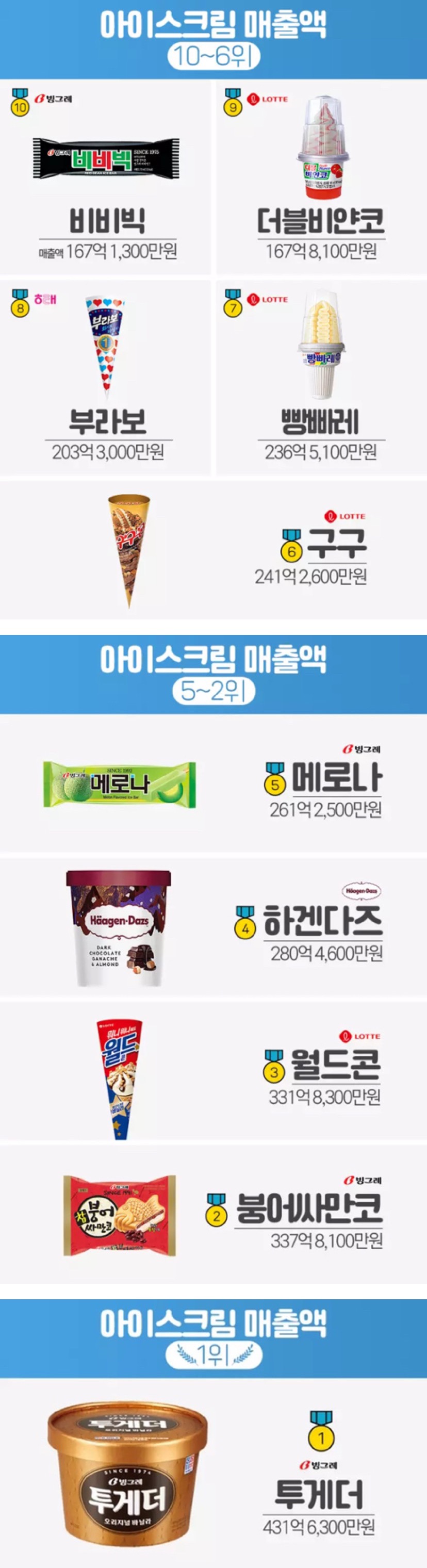 출처 : 2020년 상반기 빙과 매출액 기준 by 한국농수산식품유통공사 식품산업통계정보 하겐다즈가 단가가 높아 매출액이 높게 빠진 거 같아요 마찬가지로 투게더도...!!! 개수로만 따지면 메로나, 월드콘이 1위일 것 같아요 ㅎㅎ 2