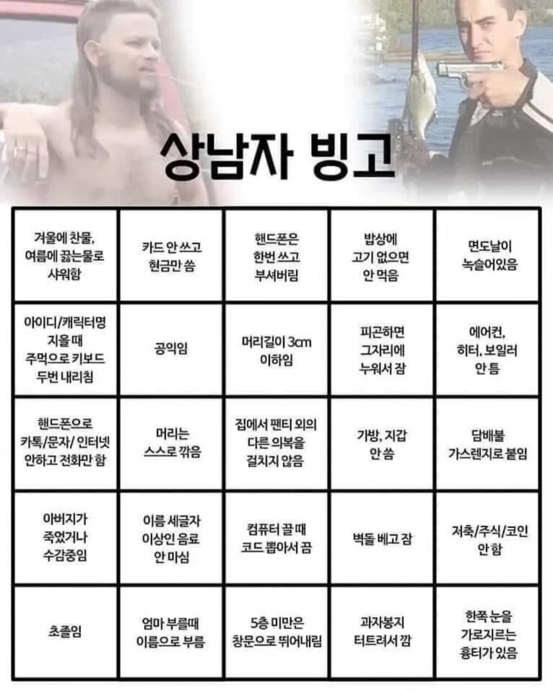 혹은 쌍남자 빙고? 웃긴데 버스 안이라 지금 미친 듯이 참고 있습니다. 아아 나는 (다행히) 상남자가 아니었다! 0