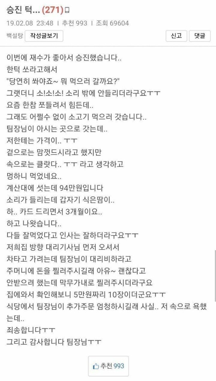 | Subject | 승진 회식턱으로 94만원이나 나온 썰....jpg |