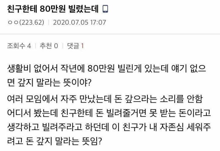 | Subject | 친구한테 돈 함부로 빌려주면 안되는 이유 |