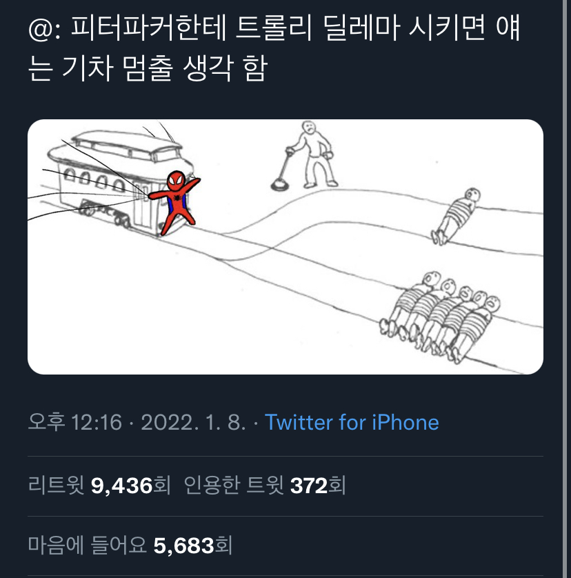 56014 피터 파커에게 트롤리 딜레마 문제를 풀게 시키면? 2 미슐랭 22/01/21 5569 0