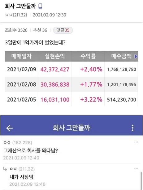 | Subject | ?? : "3일만에 1억 벌었는데 회사 그만둘까" |