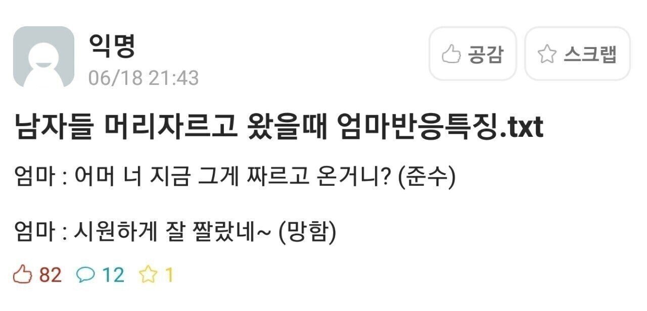 | Subject | 남자들 머리카락 자르고 왔을때 엄마 반응 |