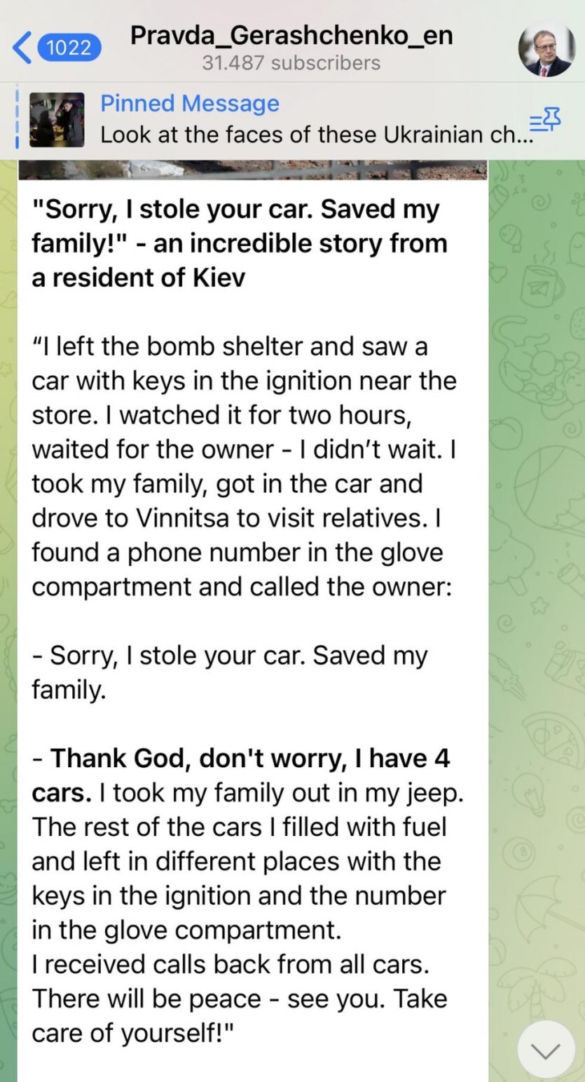 4대의 차량을 가진 어느 우크라이나 가족이 피난 떠날때 나머지 차량에 기름을 채워 키를 꽂은채 연락처를 남기고 갔는데 다른 가족이 그 차로 피난을 했고 탈출 후 차 주인에게 차를 훔쳐 미안하다 연락을 해오자 신에게 감사했다는 이야기 입니다. Sorry i stole your car. Saved my family. … 으앙 ㅜㅜ 3