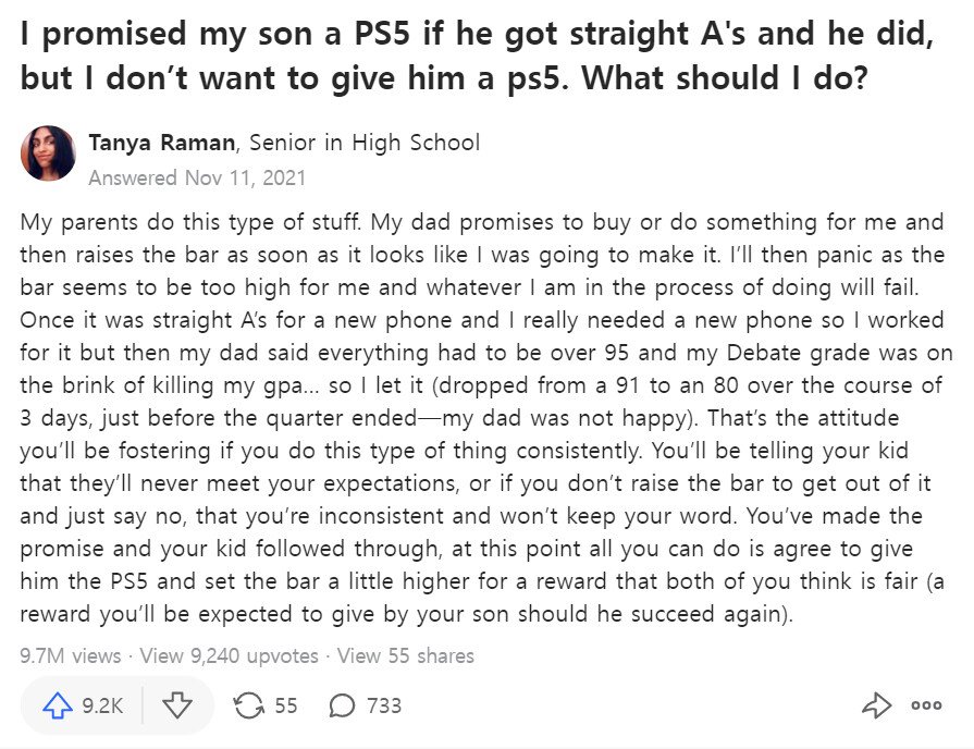 Subject   아들이 올A 받으면 플스5 사주기로 했는데 약속 지키기 싫네요. 어떡하죠?