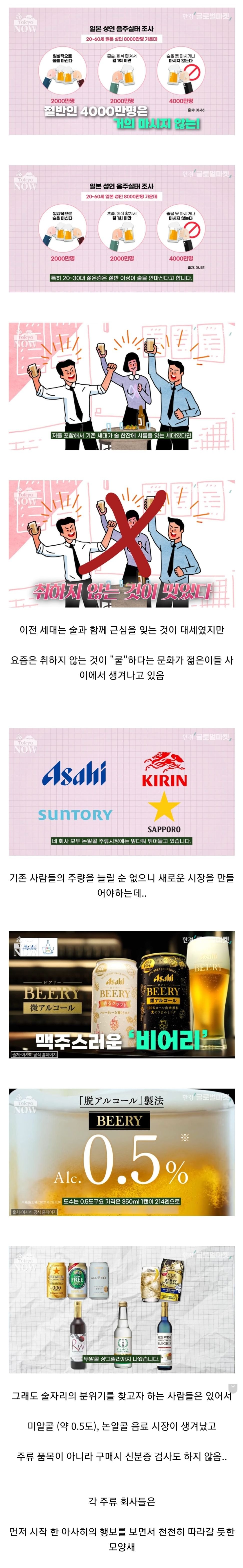 20~30대의 75%가 술을 안마시게 되면서.. 농담이 아니라 진짜 위기에 빠짐. 위기를 타개하기 위해 무알콜~0.5% 알콜 제품들을 내놓으면서 적응하려고 하는 중 0