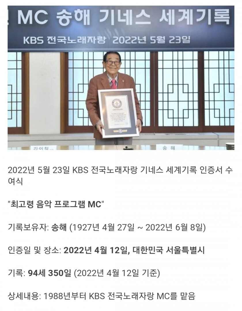 57927 16일 전 송해의 생전 마지막 공식활동.jpg 2 김치찌개 22/06/10 3868 1