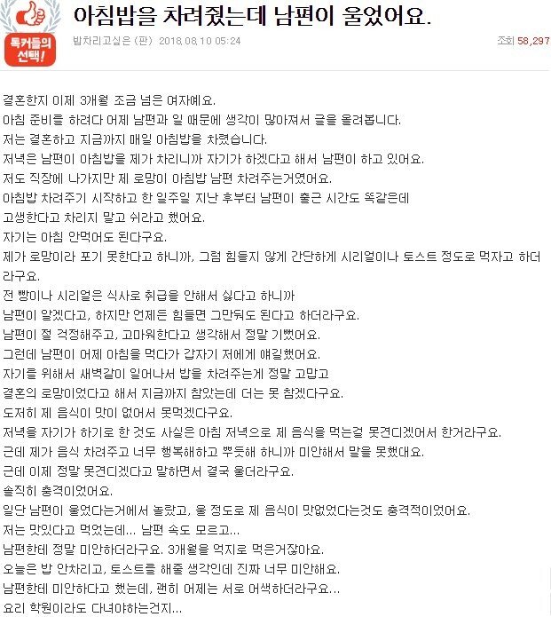 | Subject | [pann] 아침밥을 차려줬는데 남편이 울었어요 |
