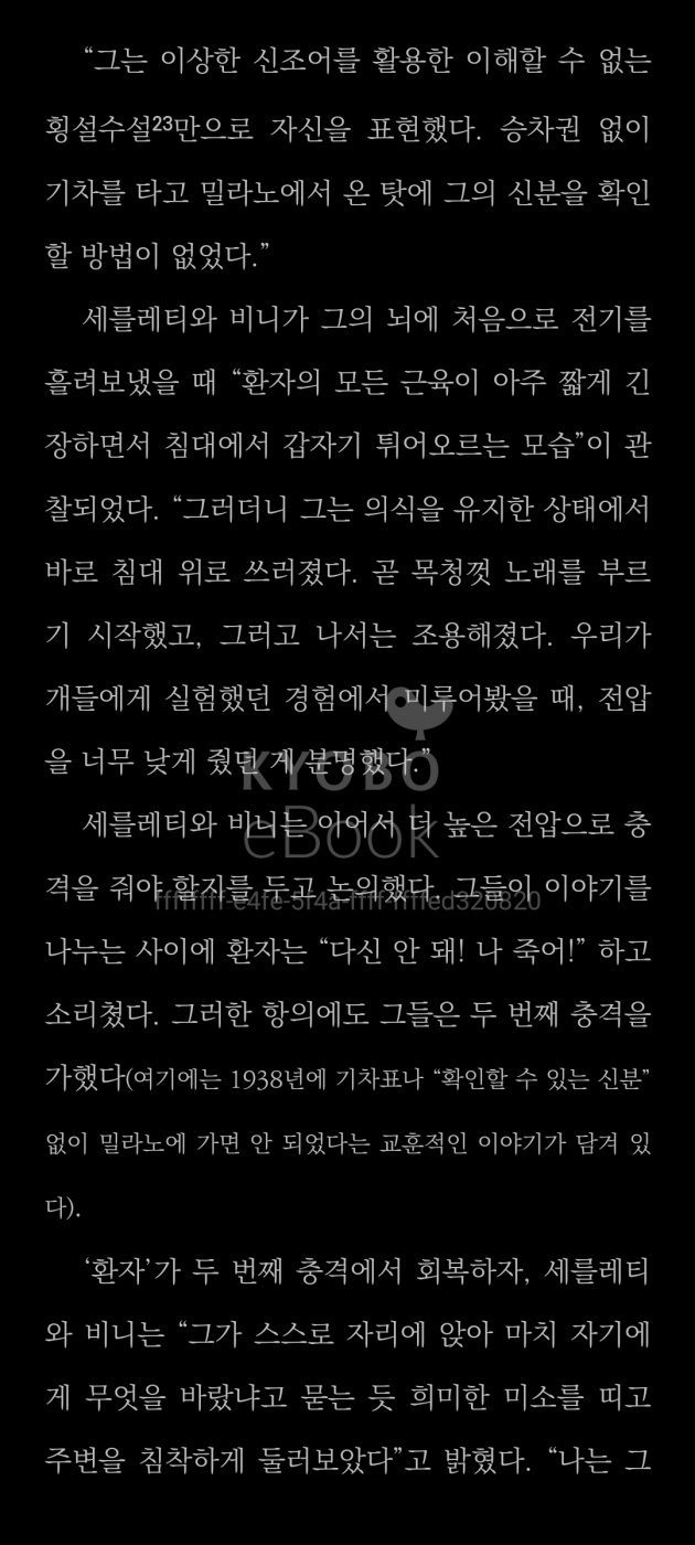 - 책 '도파민네이션' 中 세계 최초의 ECT (electroconvulsive shock therapy) 사례라고 하네요. 0