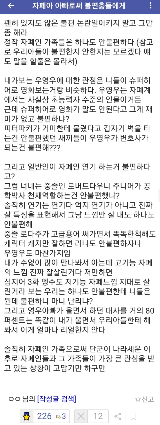 아무렴 박은빈이 너무 조심하느라고 1년동안 도망다니고 그 박은빈을 1년동안 기다린 제작진인데 그정도 신중함이 없었겠읍니까. 부족한 점은 저한테도 많이 보입니다. 존나 까고 싶기도 해요. 근데 여기에 얽힌 문제들이 현시점에서 너무 예민한 것들이 많읍니다. 단순히 장애 희화화 정도가 아닌 그 이상으로.. 지금 우영우갤러리에 온갖 진영 커뮤 빌런들 다 모여서 새벽까지 지랄난거 보면 참.. ㅋㅋ 이렇게 따뜻한 드라마를 만들어도 그걸 받아들이는 사람들이 황폐해져 있으면 아무 소용이 없구나.. 하는 생각도 들다가.. 여튼 흥행 하나는 개확실하군.. 여러 의미에서.. ㅋㅋㅋ 2