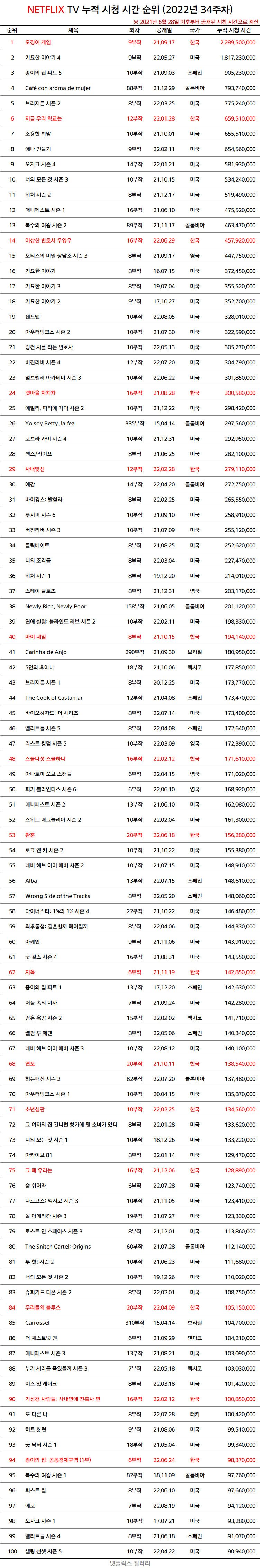 59213 넷플릭스 TV부분 누적 시청시간 순위 TOP100 1 김치찌개 22/09/13 3857 0