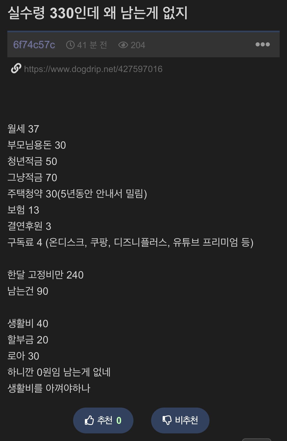| Subject | 실수령 330인데 왜 남는게 없지.jpg |