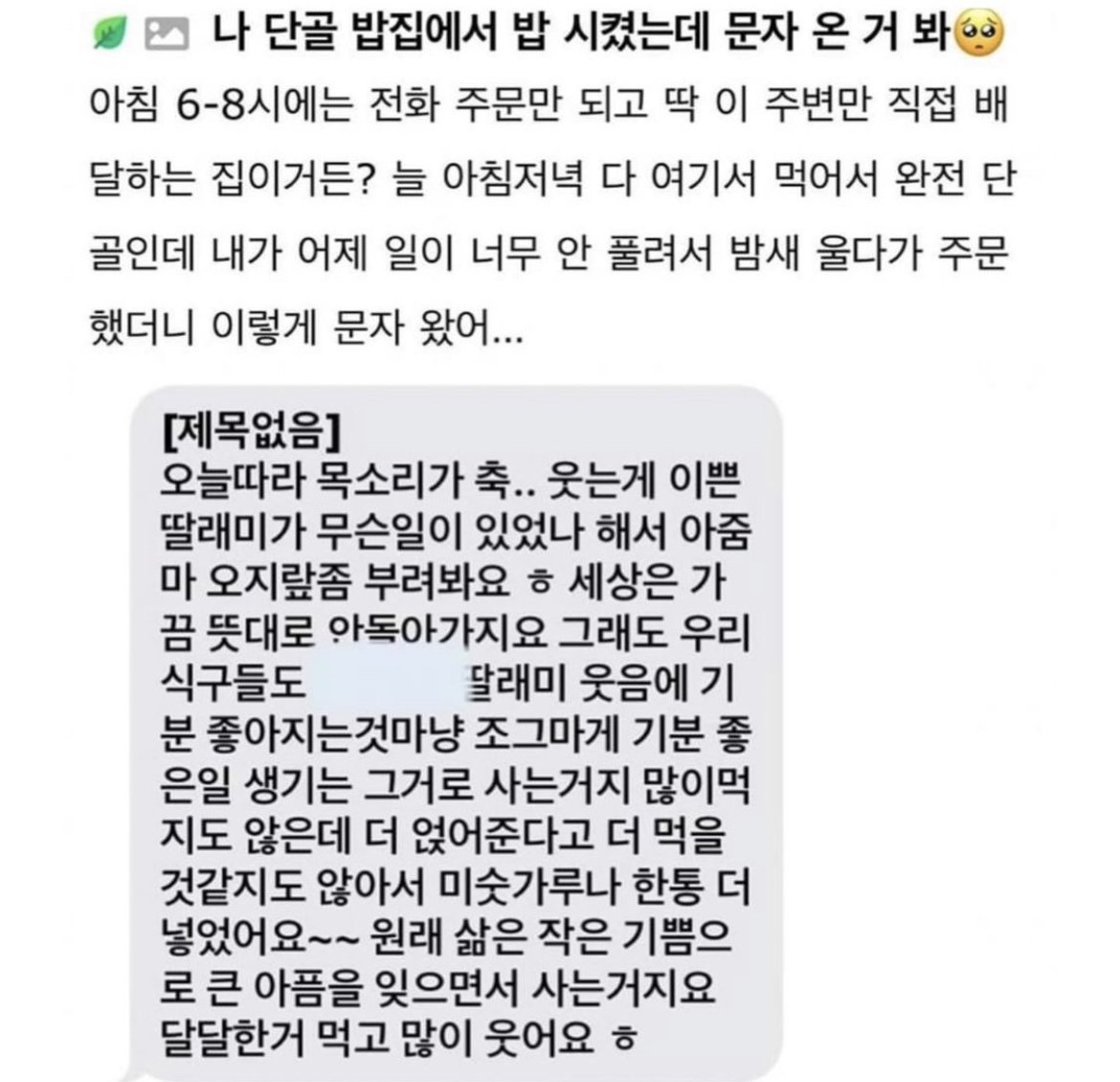| Subject | 단골 밥집에서 주문후 사장님에게 문자가 왔다 |