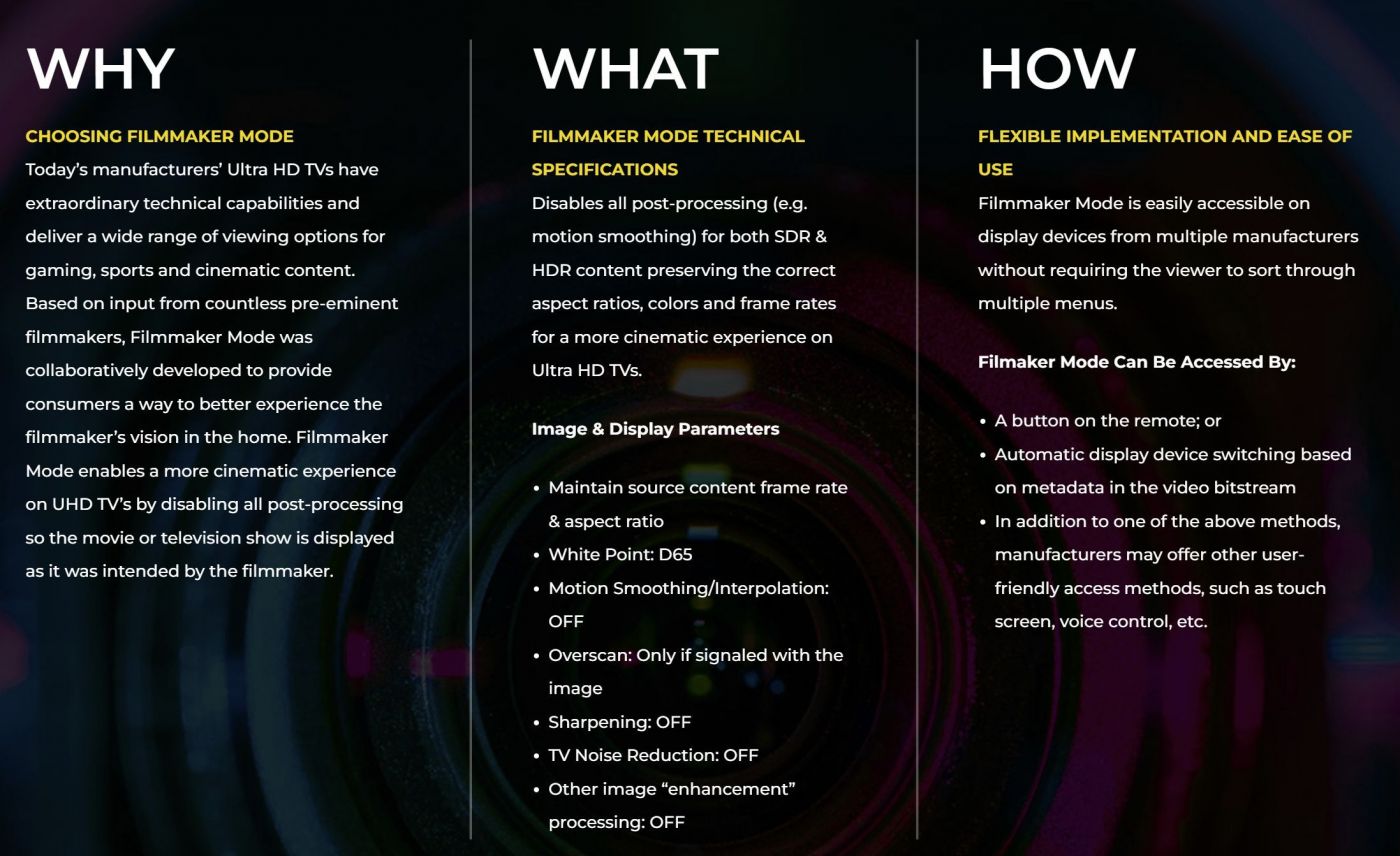 10~20년 사이에 TV에 프레임 증폭(?) 기능이 대중화되어서, 초당 60, 120 프레임 식으로 중간에 연산해서 만든 프레임을 끼워서 초당 프레임을 늘리는 기술이 마케팅이 많이 되고, 기본 모드들에는 적용되는 경우가 많은데, 때로는 부드러운 화면을 보여주기도 하지만, 영화의 경우에는 특히나 원래 제작 시 감독 등이 원하던 화면과는 다른 결과, 에러를 보여주는 경우도 많습니다. 그래서 UHD 얼라이언스에서 필름메이커 모드라는 것을 만들어 권고하고 있습니다. 프레임 증폭 기능 외에 과도한 색보정, 샤프닝, 노이즈 감쇄 기능 등도 꺼집니다. 최근의 UHD 얼라이언스 참여 제조사 TV들에는 대부분 있고, 영상 설정에서 필름메이커 모드로 설정하시면, 제작자가 원했던 영상에 가장 가까운 화면으로 간편하게 설정해서 영화를 감상할 수 있습니다. 스포츠, 게임 등이 아닌 영화, 드라마 감상 시에는 한 번 적용해 보시기를 권합니다.  필름메이커 모드가 없는 경우는 수동으로 하나하나 설정해야 합니다만, 그게 힘든 경우는 기존 프리셋 중에는 영화/필름 모드가 그나마 가장 덜 왜곡을 하는 편입니다. 블루레이 등이 아닌 방송, 스트리밍 콘텐츠에도 적용이 됩니다.