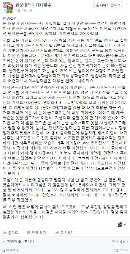 가난한 여대생이 전 남자친구에게 쓴 글