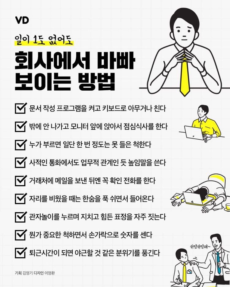 | Link #1 | https://www.visualdive.com/2019/12/%EC%9D%BC%EC%9D%B4-1%EB%8F%84-%EC%97%86%EC%96%B4%EB%8F%84-%ED%9A%8C%EC%82%AC%EC%97%90%EC%84%9C-%EB%B0%94%EB%B9%A0-%EB%B3%B4%EC%9D%B4%EB%8A%94-%EB%B0%A9%EB%B2%95/ |