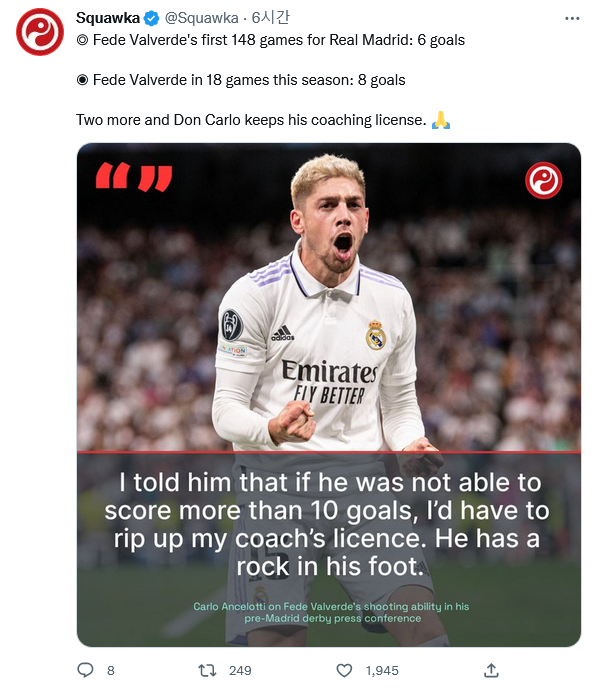 레알 마드리드의 감독 카를로 안첼로티가 페데리코 발베르데에게 실제로 한 말. 참고로 발베르데는 이전에 뛰었던 레알 마드리드에서의 4시즌 동안 총 6골을 넣었습니다. 그리고 이번 시즌은 18경기만을 치렀는데 벌써 8골. 다행히도 안첼로티는 코치 라이센스를 지킬 수 있겠군요. ![]() 이번 골도 페널티 박스 바깥에서 넣어서 결국 이 부문 단독 1위입니다. 유럽 최고의 대포라고 해도 손색이 없겠군요. ![]() 그렇다고 골만 잘 넣는 것도 아니고... 월드컵 때 한국과의 경기에서 안 보일 수가 없을 선수이니 앞으로의 주목도도 더욱 올라가지 않을까 싶어요. 1