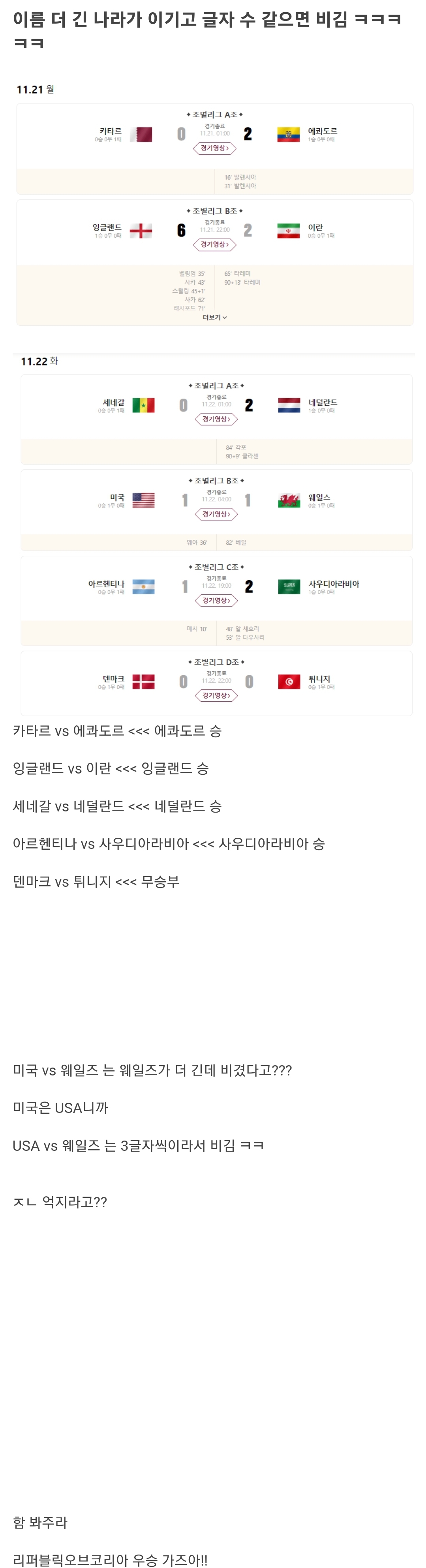 60106 이름 더 긴 나라가 이기고 글자수 같으면 비김 3 알료사 22/11/23 4104 0