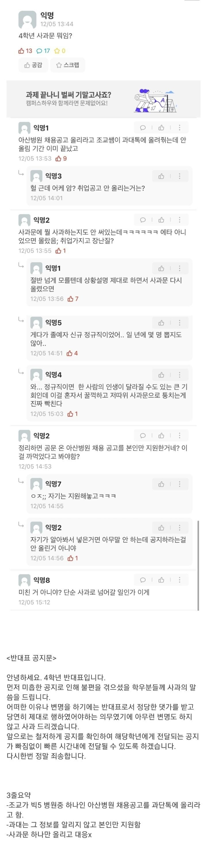 Subject   채용공고 알리지 않고 혼자만 지원한 4학년 과대
