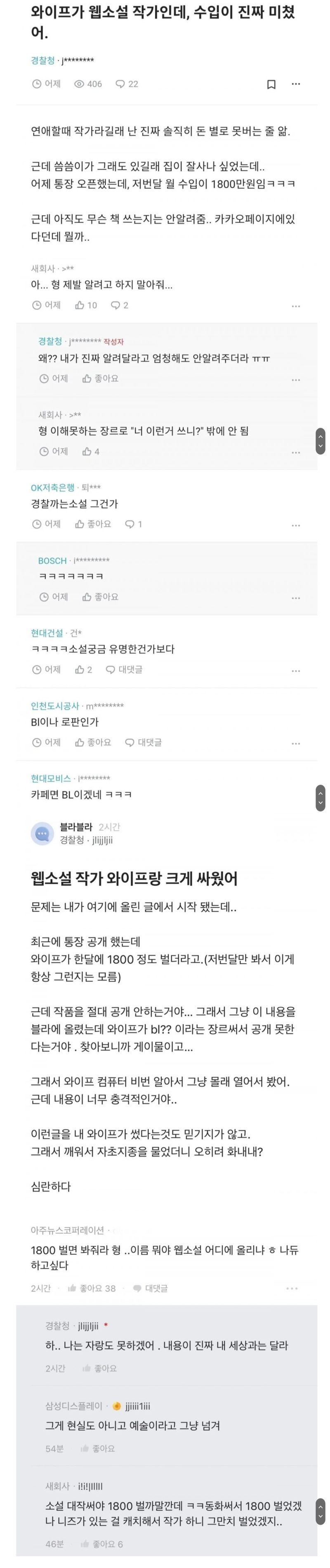 | Subject | 와이프가 웹소설 작가인데 수입이 진짜 미쳤어. |