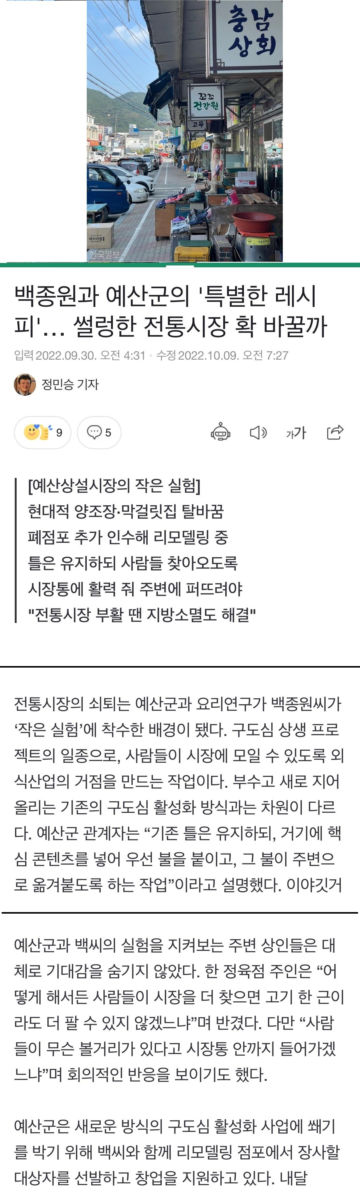 Subject   충남 예산군과 백종원이 협업한 전통시장 리모델링 근황