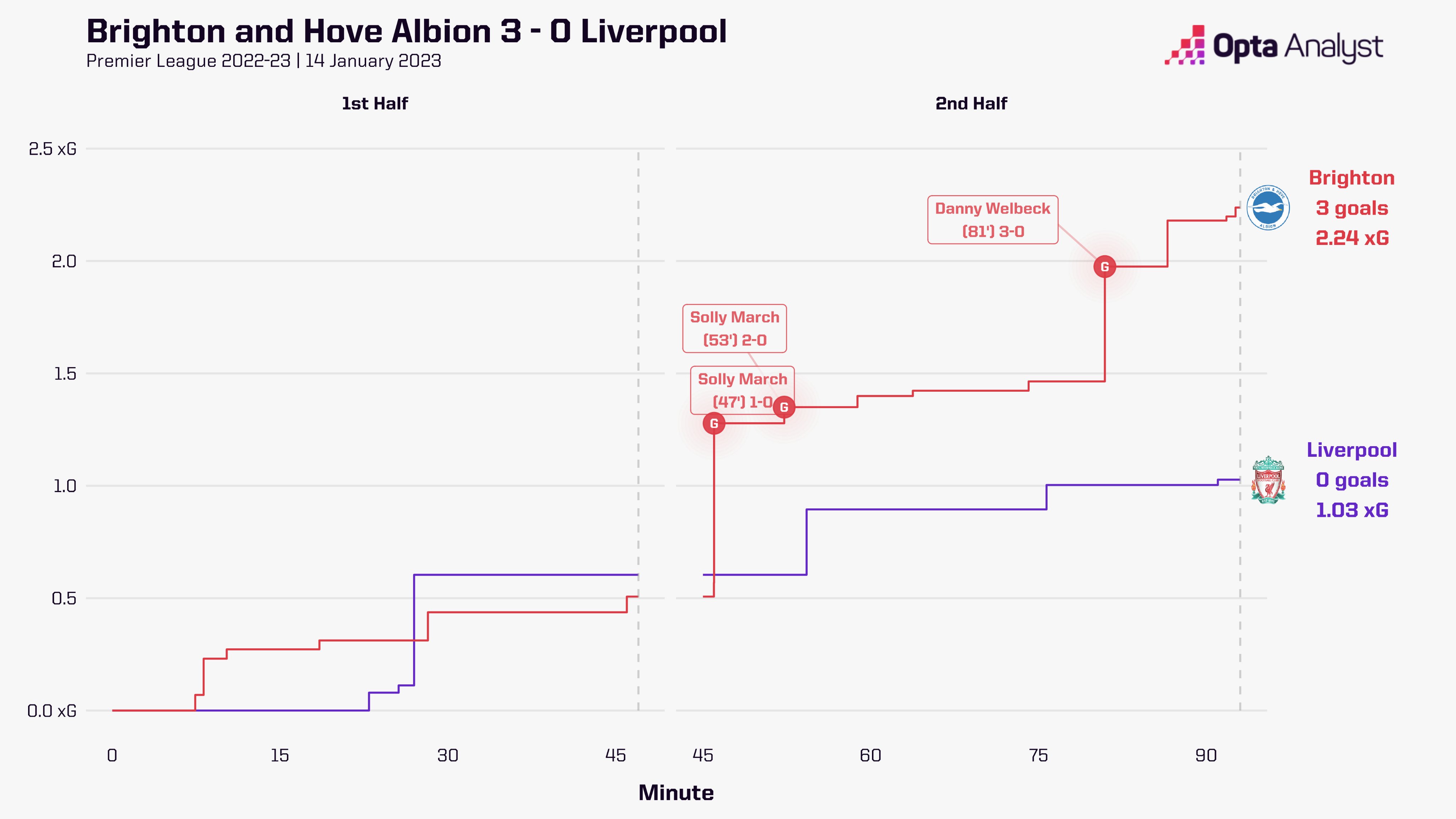 MOTD의 패널들이 리버풀의 수비진을 묘사하면서 easy라는 단어를 몇번이나 사용했는지 모르겠네요. 브라이튼이 잘한 면도 많지만 리버풀의 수비진이 너무 쉽게 공략당하고 있다는 것을 계속해서 강조하더라구요. 참고로 이 경기 브라이튼의 유효슈팅은 총 9개, 리버풀이 경기 내내 기록한 전체 슈팅 갯수(6개)보다도 많았습니다. 클롭의 팀이라고는 믿기지 않을 정도로 허술한 수비 장면들이 팀 단위적으로 보이고 있는데... 이제는 이게 이번 시즌 내에 고쳐지긴 할까 싶습니다. 0