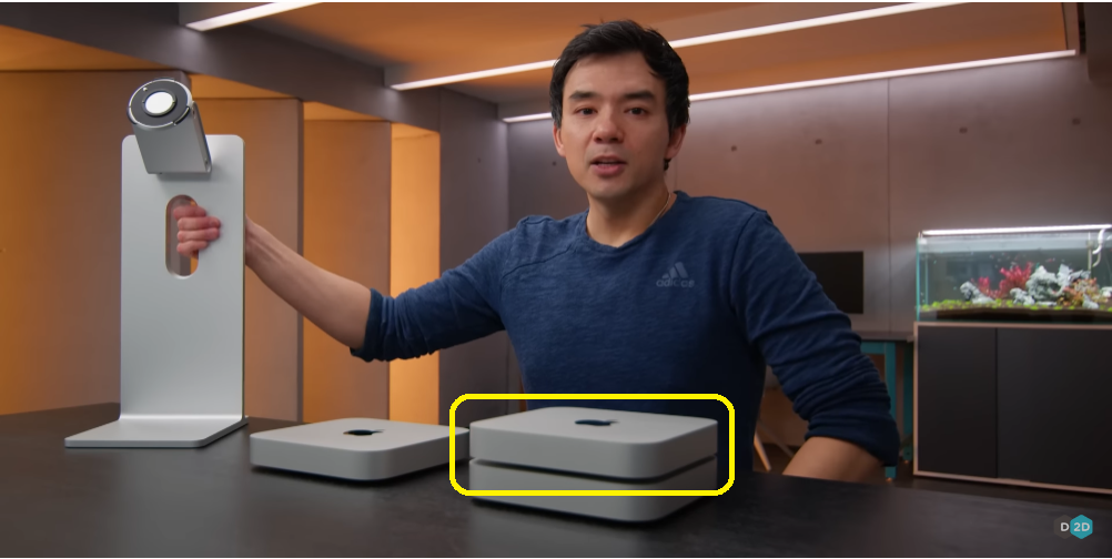 왼쪽 스탠드: 거치대 역할 가격은 $1000 맨 오른쪽 위 (노란색 네모로 표시): 강력한 m2칩을 탑재한 데스크톱 컴퓨터 가격은 $600 (학생 할인시 $500) ㅇㅇ 같은 회사 제품임 0