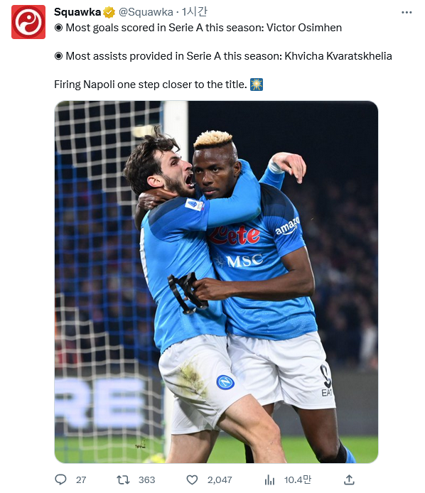 ![]() 이번 시즌은 별 이견이 없겠죠? 이번 시즌 세리에 A 최다 골을 기록하고 있는 오시멘, 최다 어시스트를 기록하고 있는 흐비차가 또다시 골과 어시스트를 추가하며 완승을 거둔 나폴리입니다. ![]() 흐비차의 활약이 참 좋았다고 주목하는 스쿼카. ![]() 이번 시즌 5대 리그 소속 선수 중에서 모든 대회 기준 10+골 10+어시스트를 동시에 기록하고 있는 선수는 5명이 있다고 합니다. 메시, 네이마르, 콜로 무아니, 그나브리, 흐비차. 그리고 이 중에서 가장 어린 선수가 흐비차라고. ![]() 나폴리는 여전히 1위를 순항 중이네요. 0