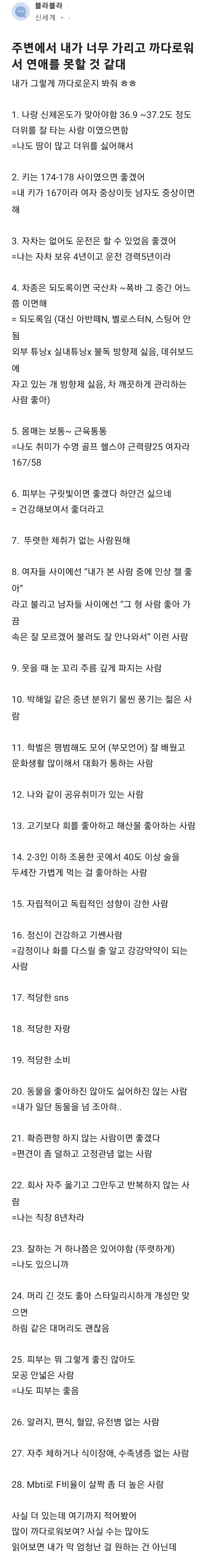 | Subject | 주변에서 내가 너무 가리고 까다로워서 연애를 못할 것 같대 |
