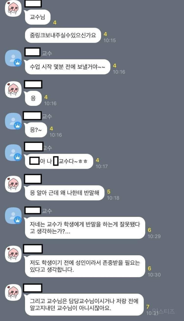 학생이 잘했다는 건 아니지만 의견에는 동의합니다. 교수라고 초장부터 반말할 권한이 있는 건 아니라고 생각하네요 저도 ㅎㅎ