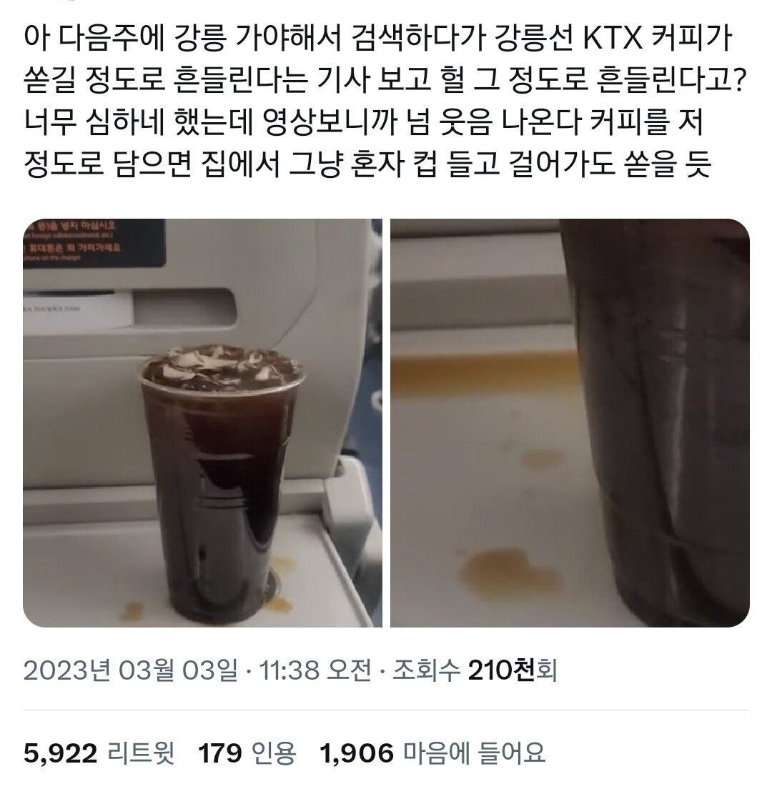 | Subject | 커피가 쏟아질 정도로 흔들린다는 KTX 강릉선 |
