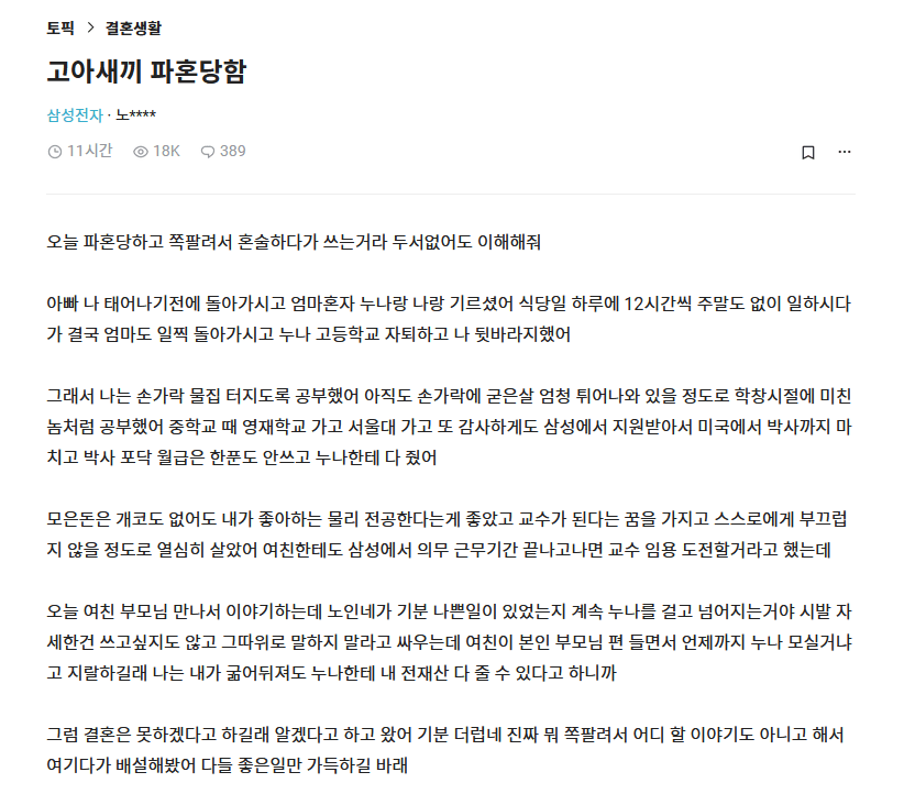 사실 주작같긴 하지만 글쓴이가 파혼당한건 아니고 파혼한 케이스군요. 여친 부모님 앞에서 '내가 굶어뒤져도 누나가 먼저'라고 하는 건 파혼하잔 얘기긴 하죠. 뭐 파혼이 옳은 결정일 수도 있기는 하지만요.