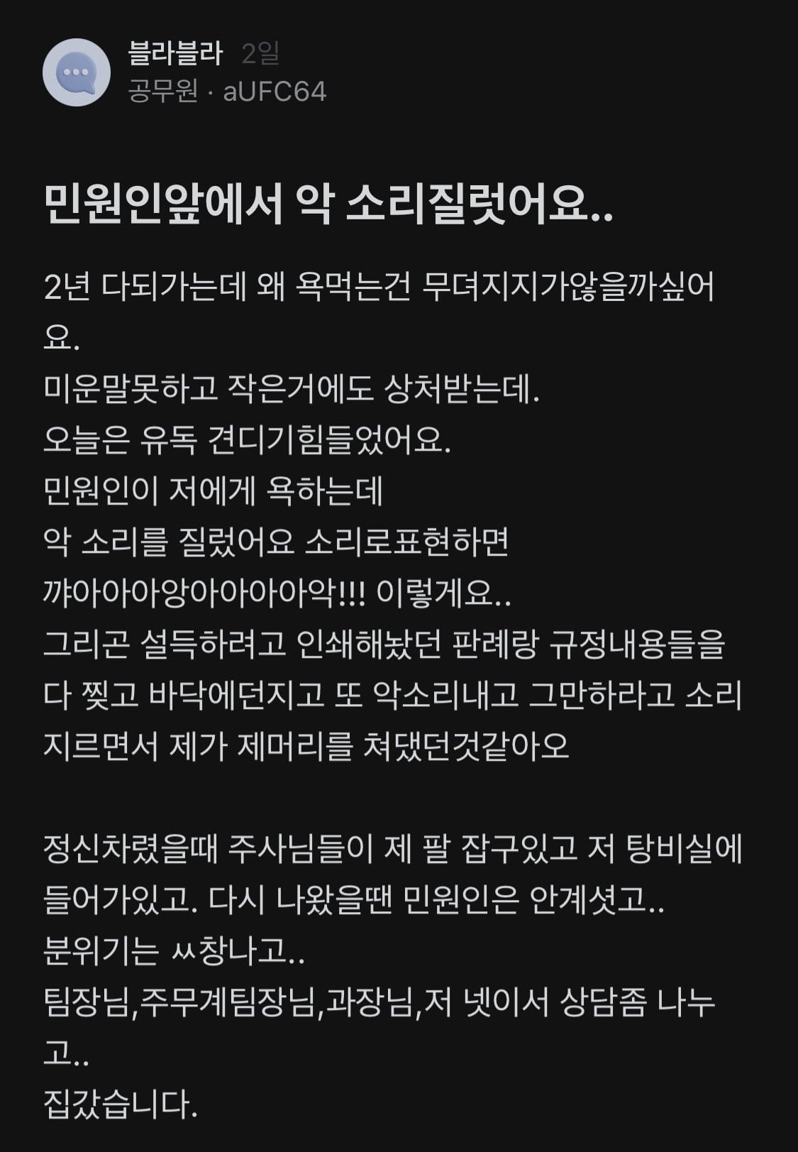 | Subject | 민원인 앞에서 소리 질렀어요.. |