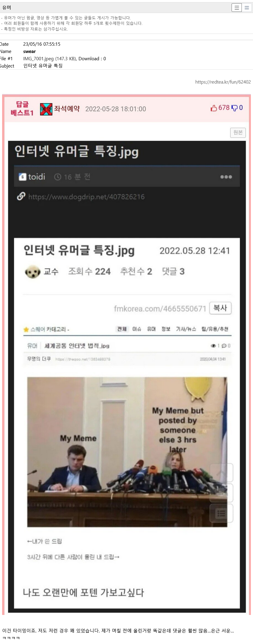 - 유머가 아닌 펌글, 영상 등 가볍게 볼 수 있는 글들도 게시가 가능합니다.