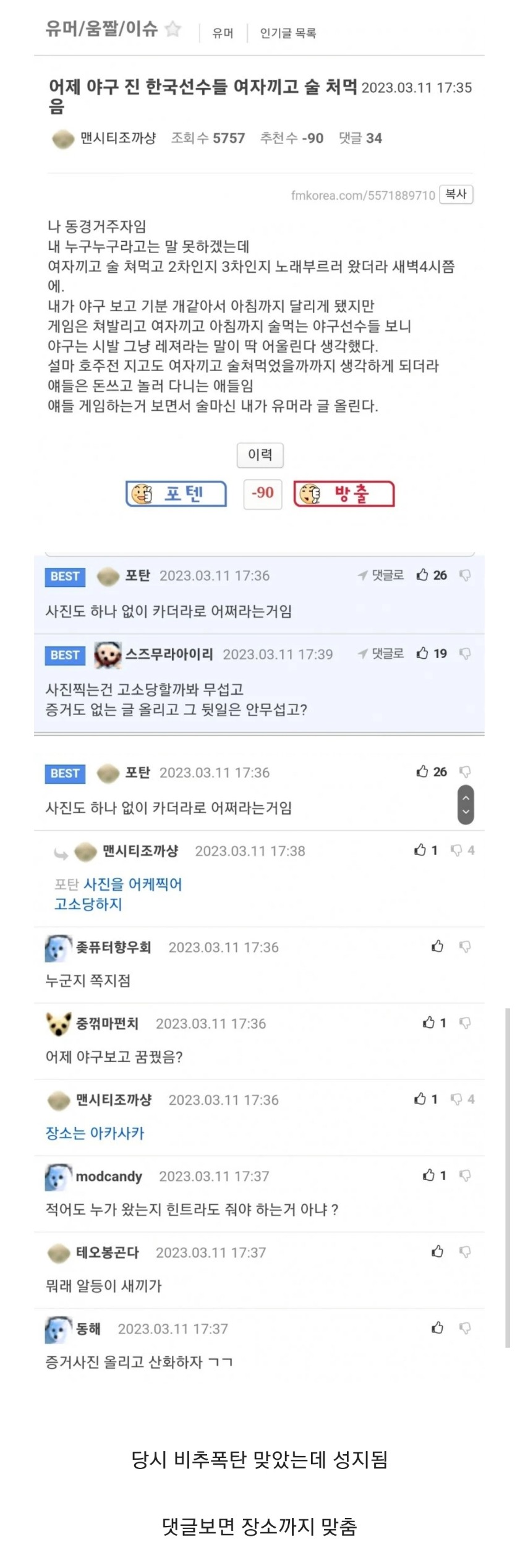 WBC 야구선수들 술 마신날 커뮤니티에 올라왔던 목격자글 0