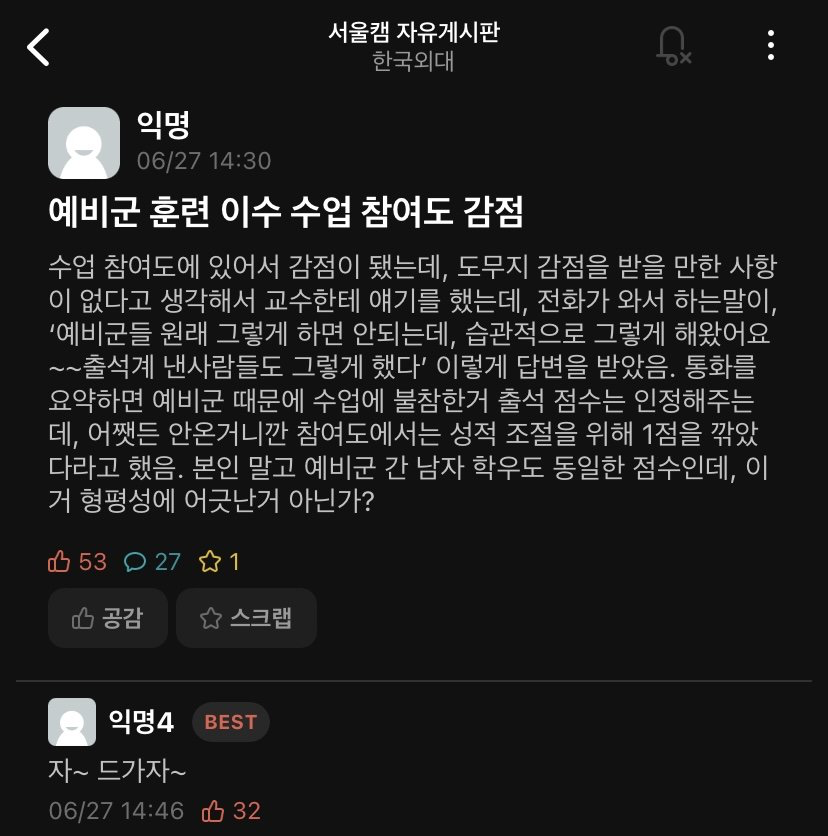 어 그래~ 출석은 인정, 근데 점수는 까겠음. 이건 국방부탓입니다. 예비군불참하면 고소고발로 전과자 만들기엔 열과성의를 다하면서 학생들이 불법행위를 당하는 건 나몰라라~~ 0