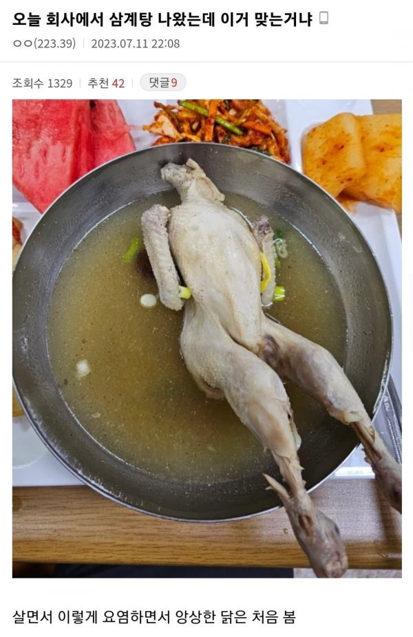 63128 오늘 회사에서 삼계탕 나왔는데 이거 맞는거냐 5 swear 23/07/12 4195 0