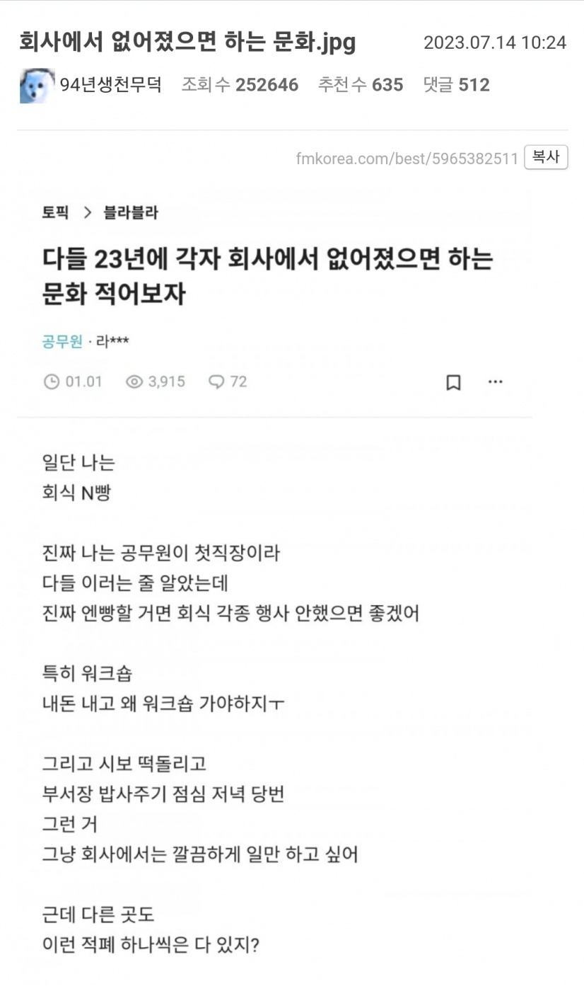 회사 회식을 내돈 내고 해? 시보 때 돈이 어딨다고 떡, 마카롱., 케익을 돌려? 부서장이 신입들 코묻은 돈으로 밥을 얻어먹어? 신입이 식사 당번을 해??? 0