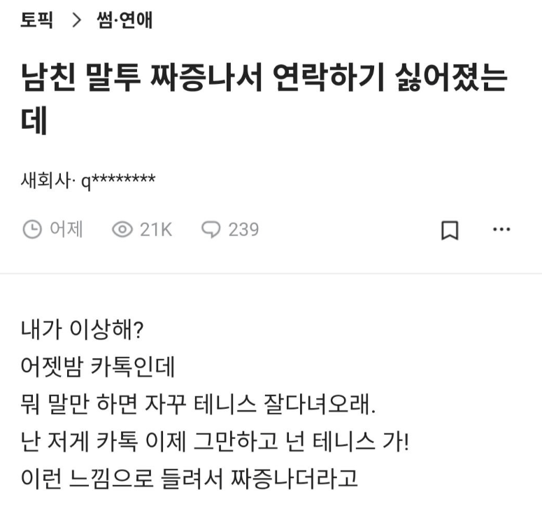 Subject   남친말투 짜증나서 연락하기 싫어졌는데