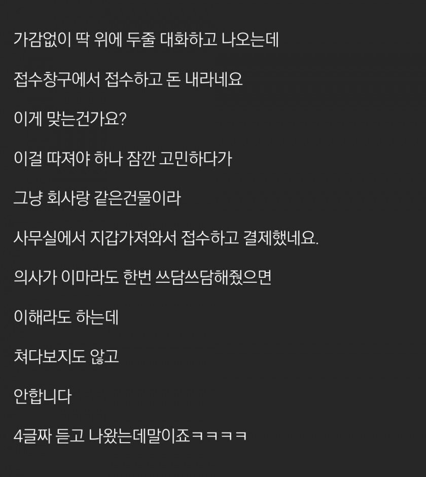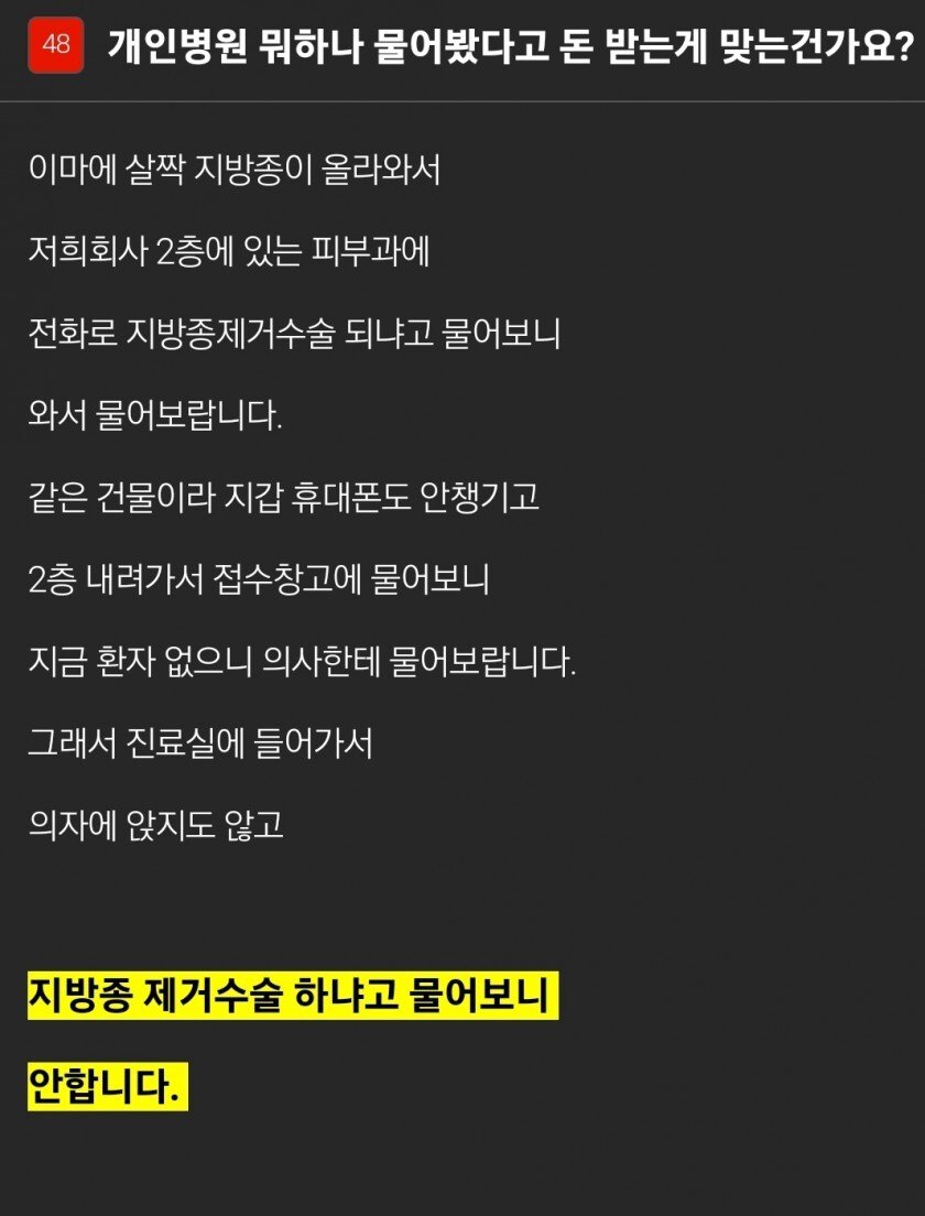 | Subject | 개인병원 뭐하나 물어봤다고 돈 받는게 맞는건가요? |